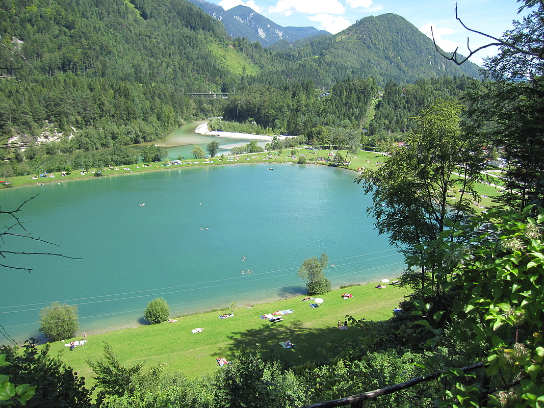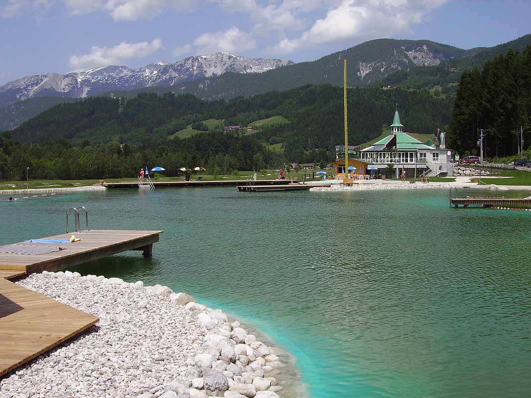 The swimming lake Lake Elisabeth in Kniewas is 12.2 km from our house. At the entrance to the valley of the Stodertal is this 6,500 sqm large former gravel pond which has been converted into a family swimming lake. Around the lake there are spacious sunbathing lawns with enough trees to provide shade. Although a natural lake with 4.5 m depth, the swimming lake warms up very quickly to a pleasant bathing temperature of about 23 degrees. Parallel to this is the beginning of the reservoir of Klaus. Directly connected to the swimming lake Lake Elisabeth is a campsite..