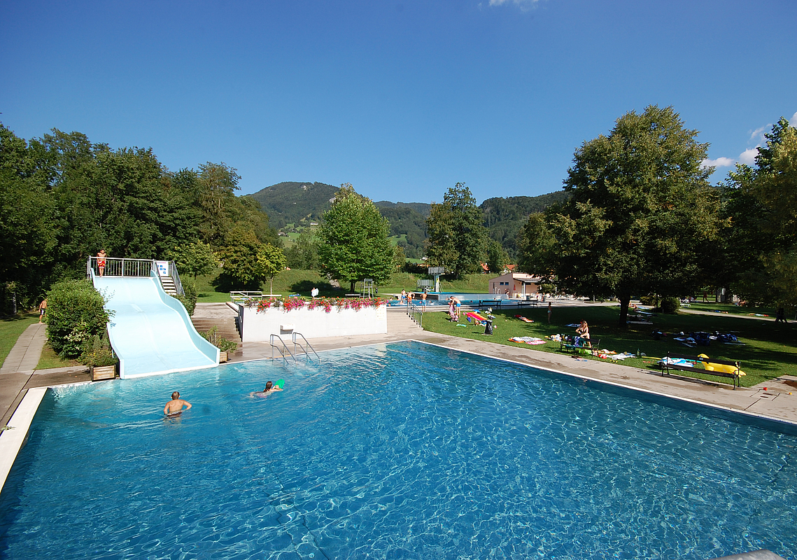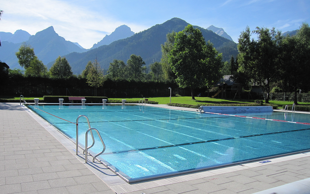 The outdoor swimming pool Hinterstoder, is located 2. 5 km from our house, in the centre of Hinterstoder in the leisure park. For your swimming fun there is a 25 m long and 12 m wide nirosta swimming pool with diving blocks. Solar heating ensures rapid heating to at least 24 degrees water temperature. The outdoor swimming pool in Hinterstoder has a non-swimmers area with 90 cm water depth. In addition, a children’s pool with 12 sqm of water surface and a small elephant slide. Around the swimming areas you will find plenty of sunbathing areas and playgrounds. Additionally, there is a restaurant right next to the bathroom.